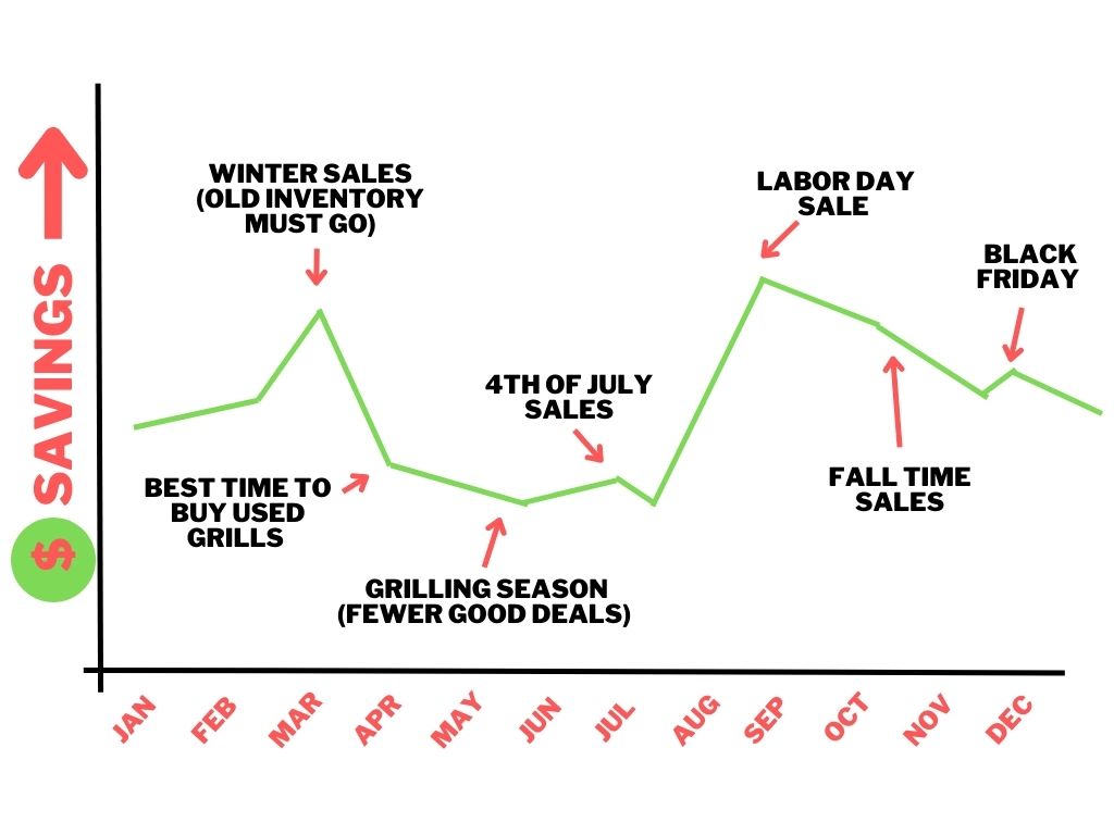 April through August are the best times to find quality used grills. Most of these grills are sold by someone looking to upgrade and needing a few bucks to help foot the bill. Sure, there are plenty of junkers out there but with a little searching and some patience, you might find a gem.